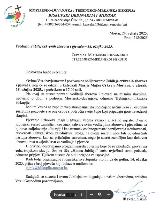 Ovime Vas obavještavam i pozivam na obilježavanje Jubileja crkvenih zborova i pjevača, koji će se održati u katedrali Marije Majke Crkve u Mostaru, u utorak, 18. ožujka 2025., s početkom u 17.00 sati.