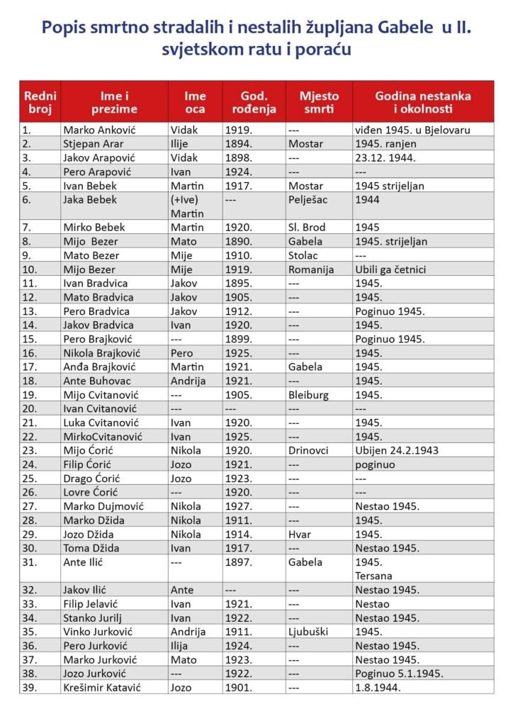 DA IM SPOMEN OČUVAMO Župa Sv. Stjepana Gabela Dragi župljani župe Sv. Stjepana Gabela! Donosimo popis smrtno stradalih iz Gabele…