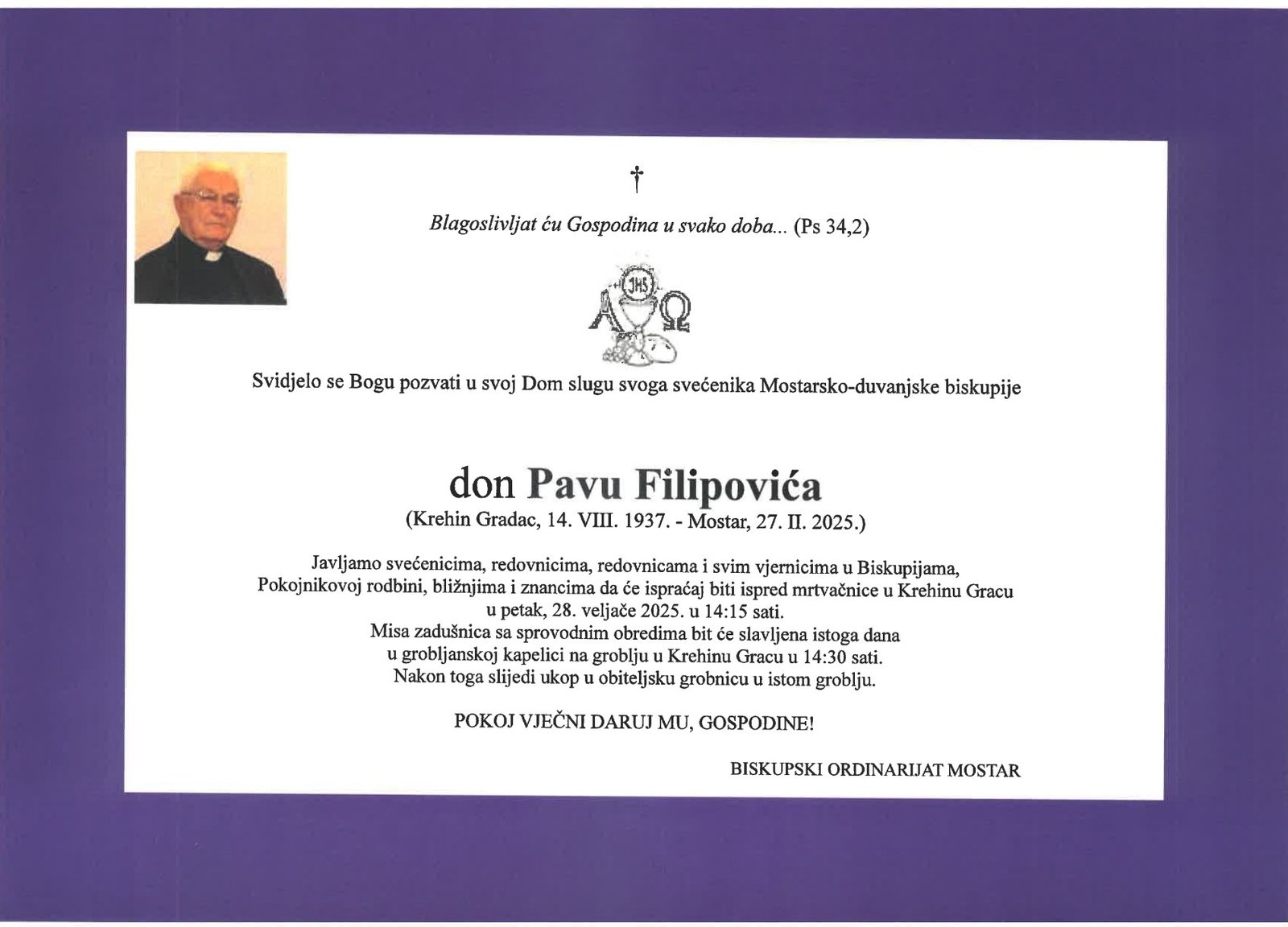 Pokoj vječni daruj mu Gospodine mario.chuljak@gmail.com don pavao Filipović Povezane objavePrva ispovijed i pričest11.05.2024Župne obavijesti župe Gabela (29. nedjelja kroz godinu – sveti Ivan Pavao II)21.10.2023Župne obavijesti • I. Korizmena nedjelja • 22.2.2026.20.02.2026 Ostavite prvi komentar (Otkaži odgovor)Ime * E-mail * Web stranica Spremite moje ime, e-poštu i web stranicu u ovom pregledniku za moje sljedeće komentare. Komentar * Prethodna objavaJubilej crkvenih zborova i pjevačaSljedeći postŽupne obavijesti • VIII. nedjelja kroz godinu • 2.3.2025.