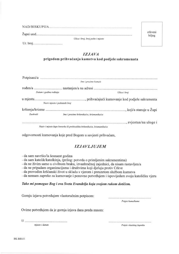 Izjava prigodom prihvaćanja kumstva kod podjele sakramenata